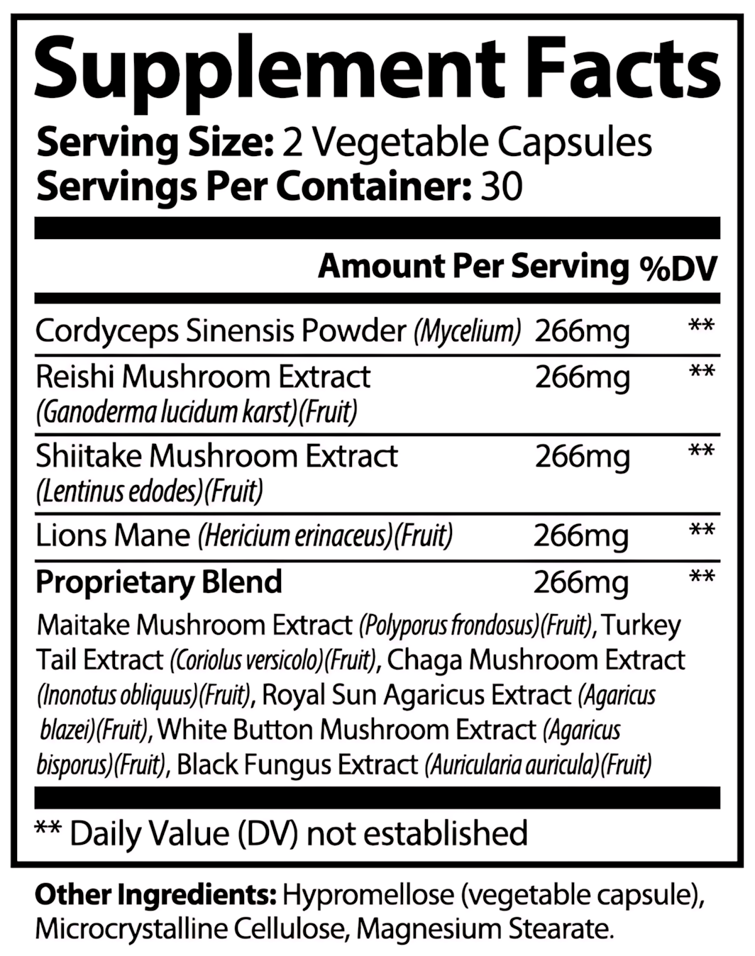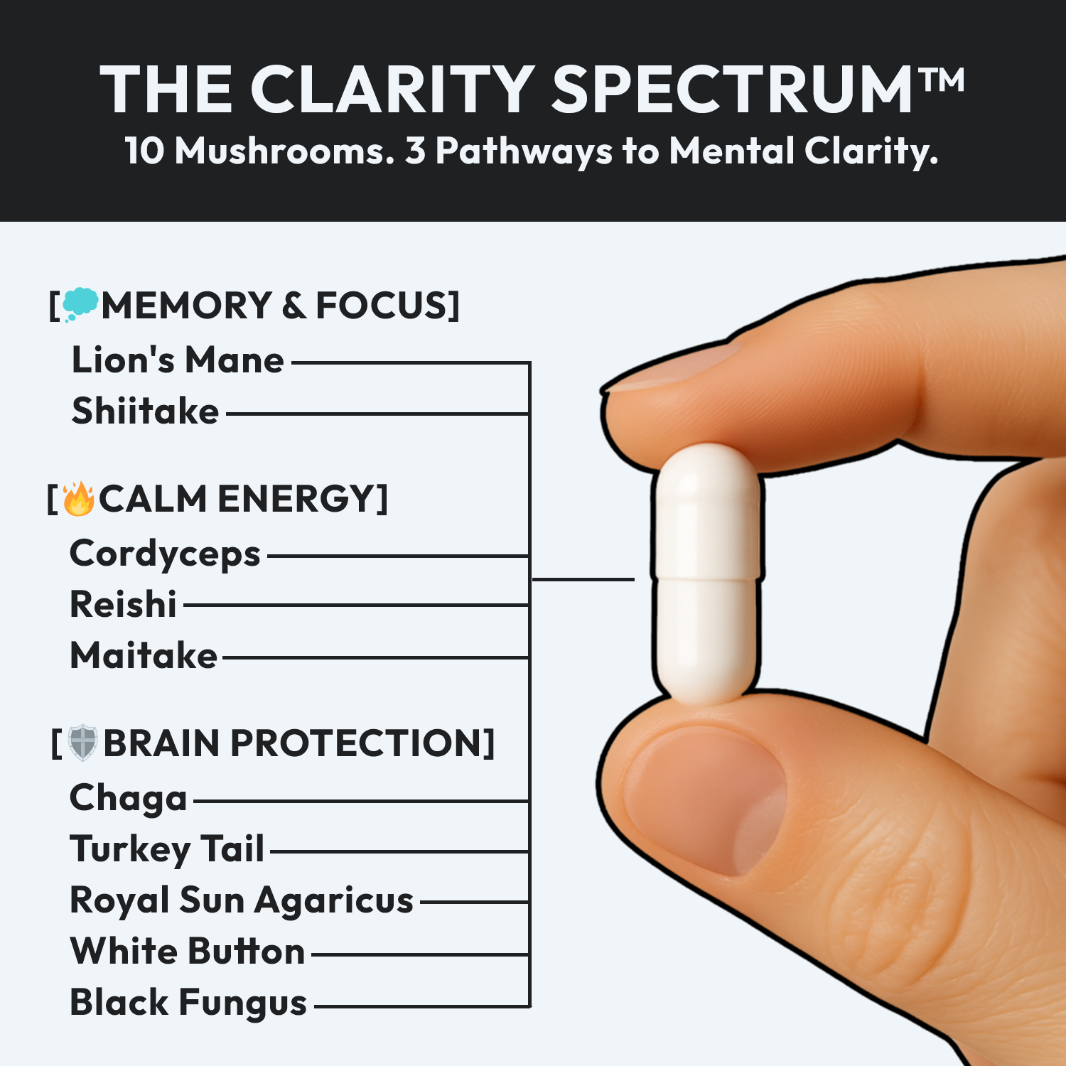 around well-studied Lion's Mane, Cordyceps, Reishi, Chaga and supported by anti-oxidant, anti-inflammatory fungi.
